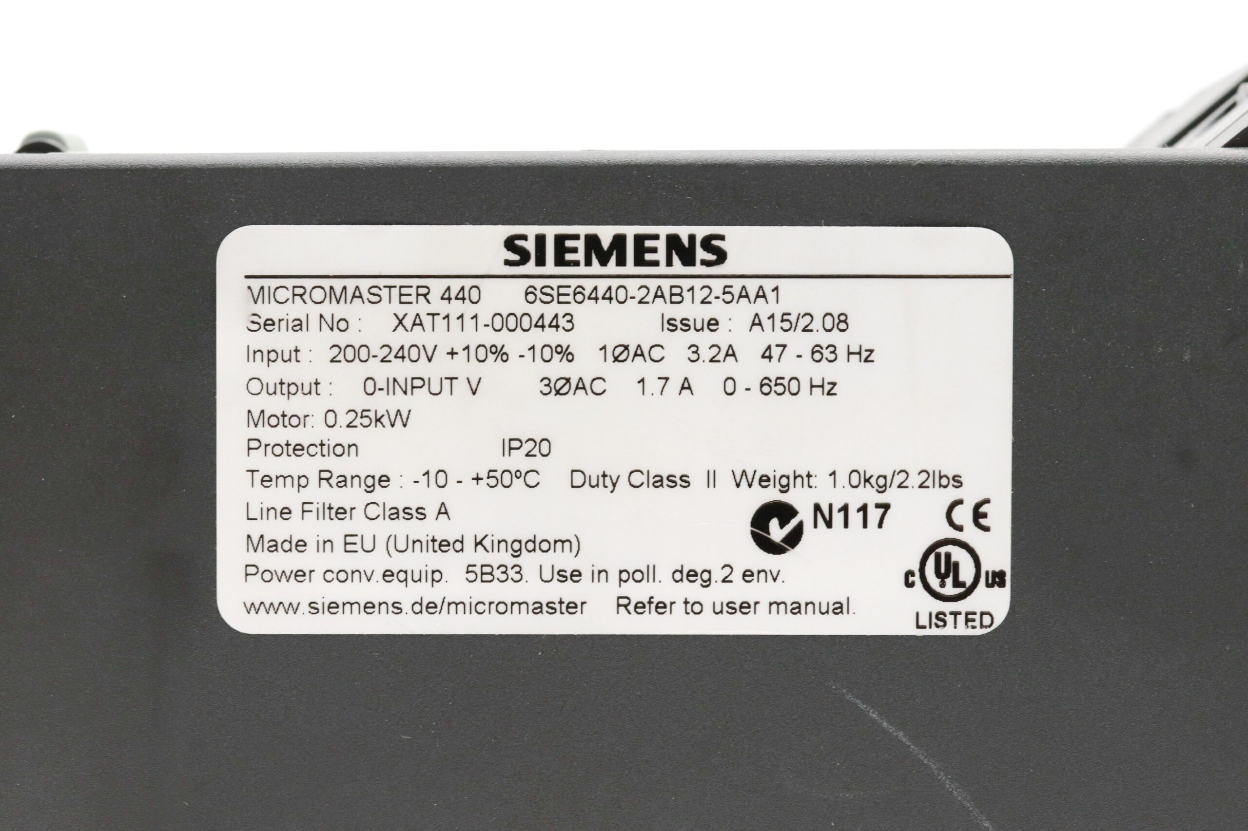 Siemens 6SE6440-2AB12-5AA1 MICROMASTER 440, 0.25kW A15/2.08 + 6SE6400-0BP00-0AA0