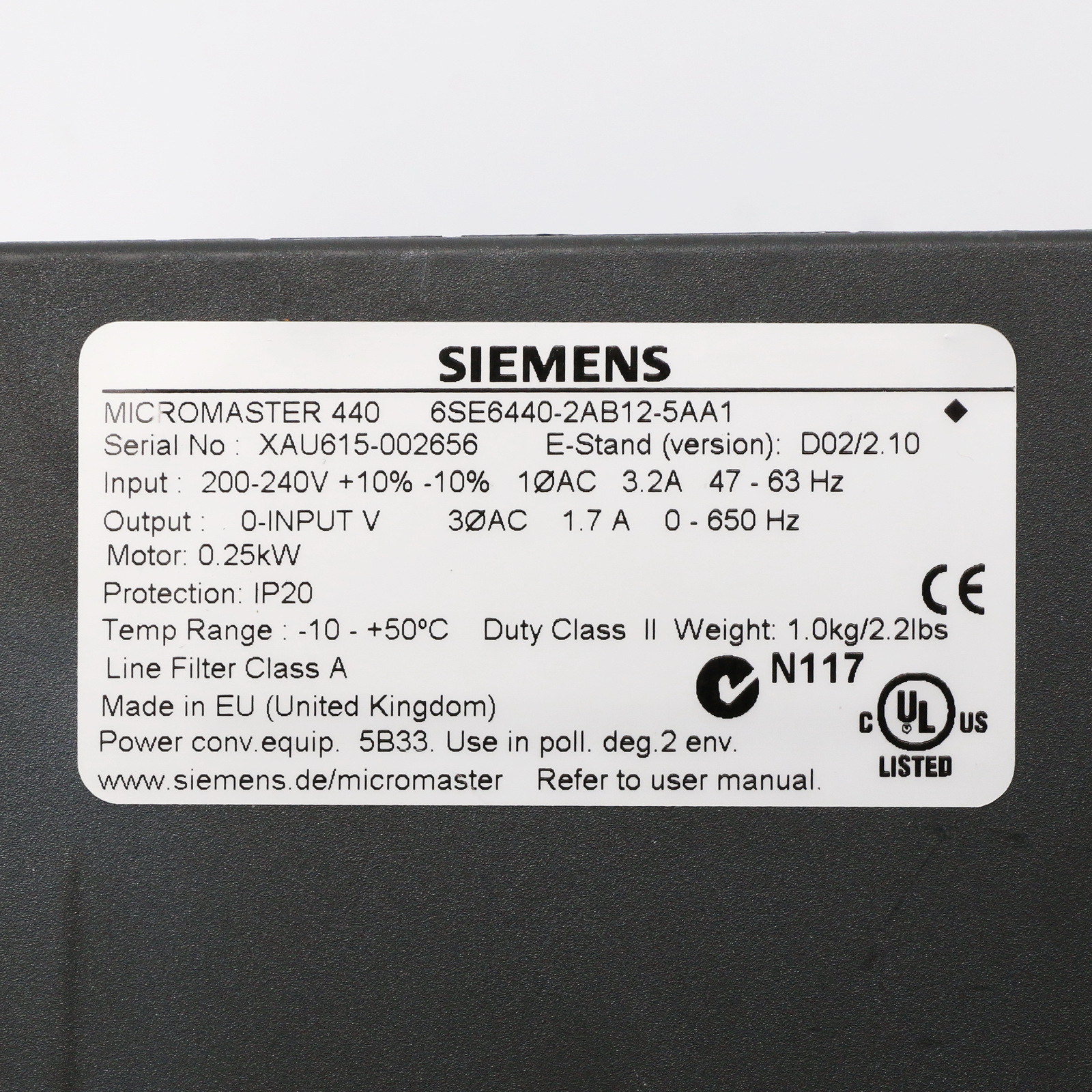 Siemens 6SE6440-2AB12-5AA1 MICROMASTER 440