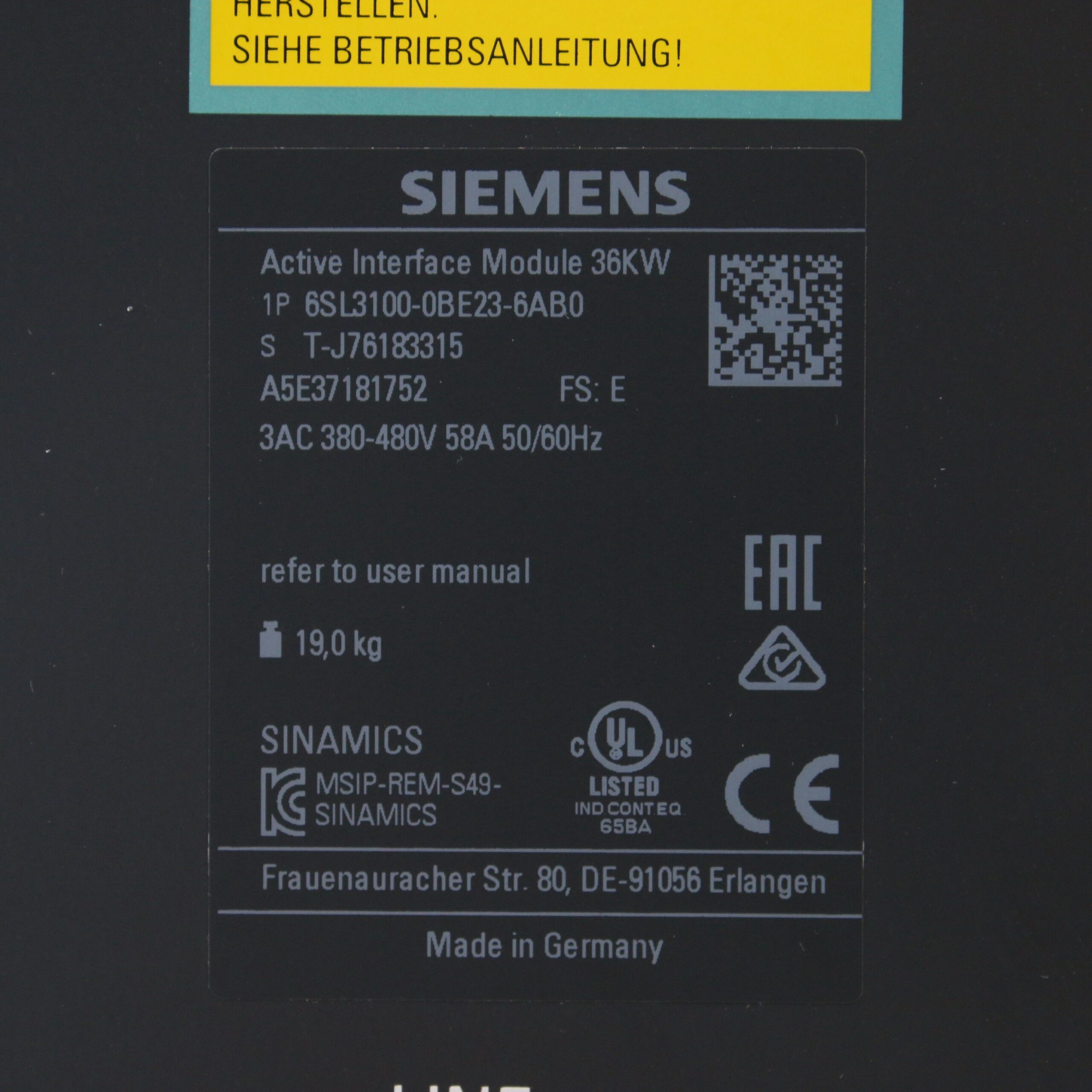 Siemens 6SL3100-0BE23-6AB0 Active Interface Module 36KW | FS: E